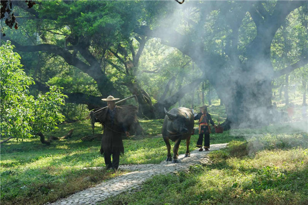 清晨的阳光从古榕树群的树梢倾泻下来,穿过潮湿的水汽,氤氲朦胧,犹如仙境。当地人穿着蓑衣、牵着牛儿,沿着狭窄的鹅卵石小路走向田间地头,我想五柳先生“采菊东篱下”的恬静生活大抵如此吧!