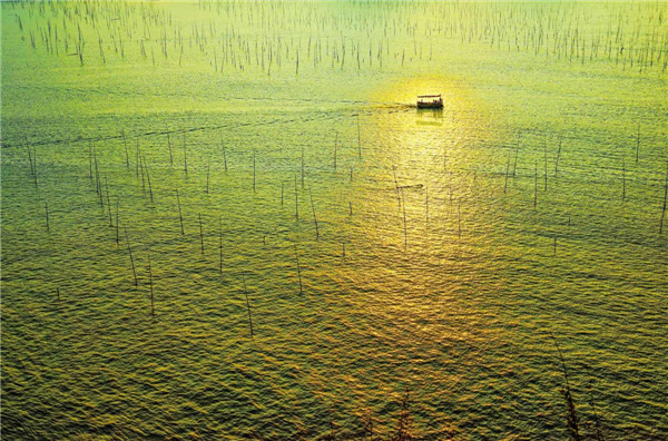 夕阳下,海风轻抚平静的海面,激起五彩斑斓的涟漪。渔民们撑着渔船过金黄的海面,迎着朝霞满仓归来。