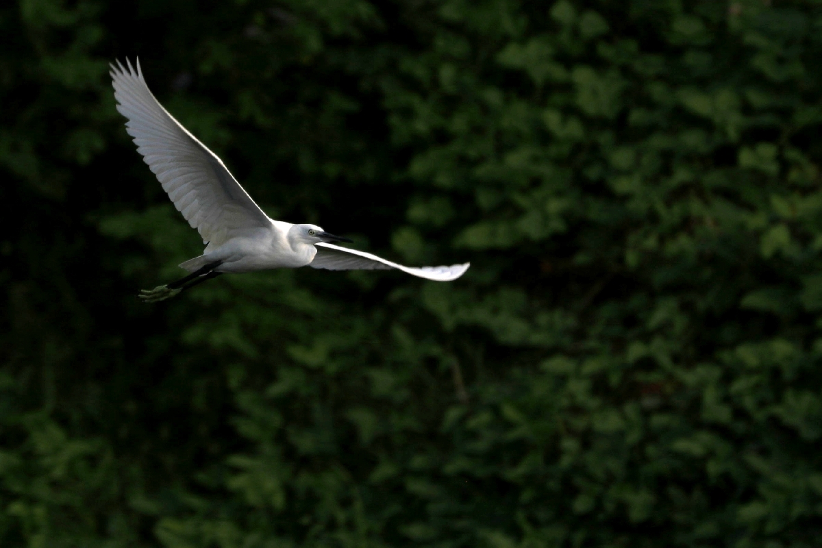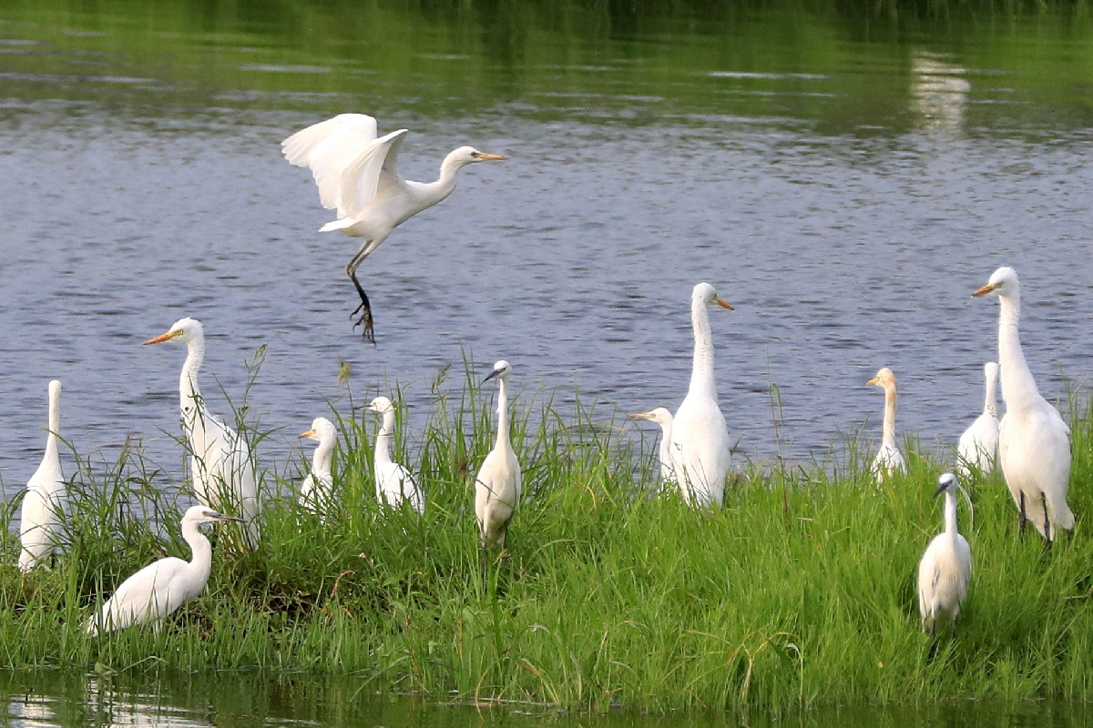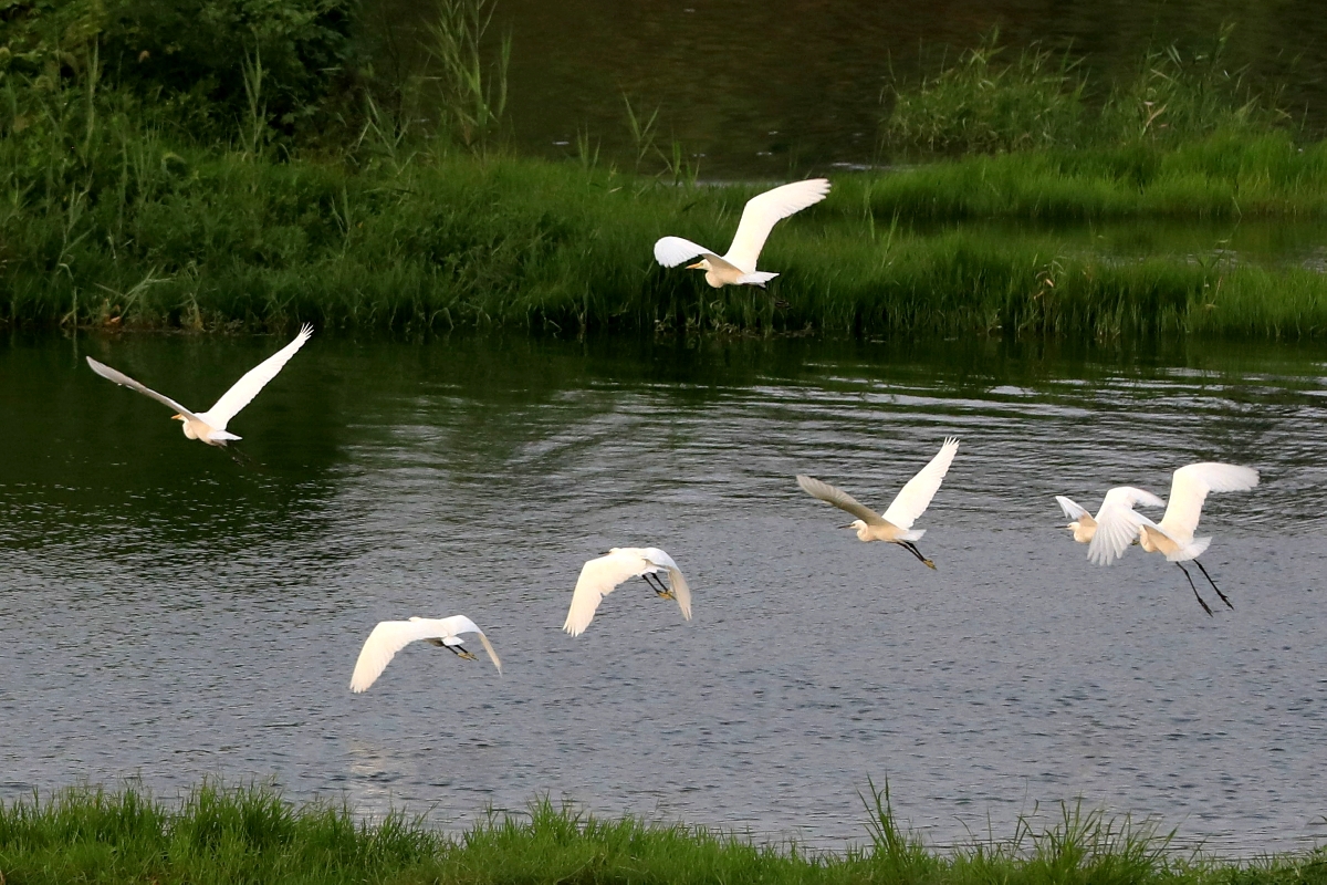 一群群白鹭,相聚而栖,驻足观望,时而翩翩而飞,像是在欣赏这个美丽的夏秋之季;时而引颈长鸣,像是演绎着美妙激昂的多重唱;时而振趐而跃,像箭一般飞向远方。