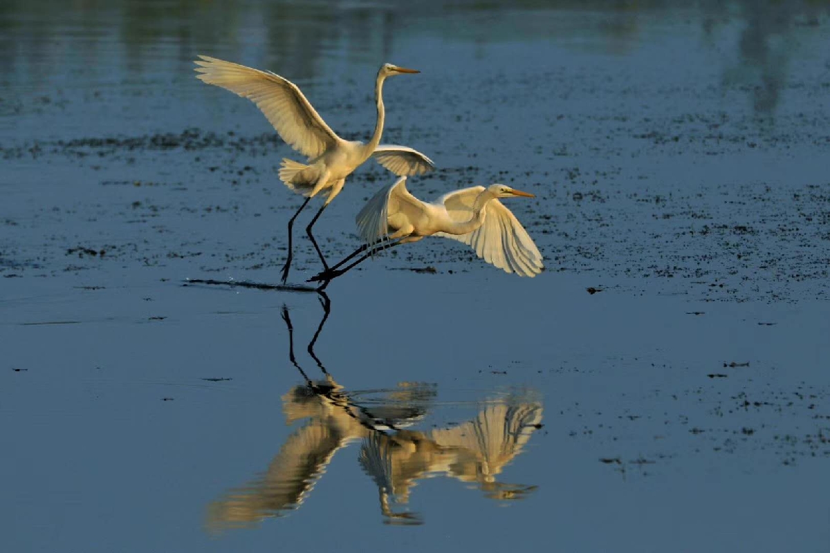 湖水清澈,湖中的倒影显得它们更加秀丽,两只白鹭鸟在水面自由地嬉戏,恰与湖水相映成趣。