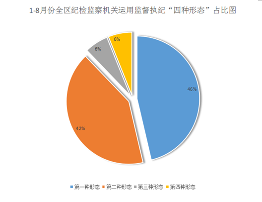 运用监督执纪“四种形态”处理82人次。其中,第一种形态38人次,占“四种形态”处理总人次的46%;第二种形态34人次,占42%;第三种形态5人次,占6%;第四种形态5人次,占比6%。