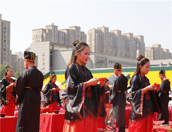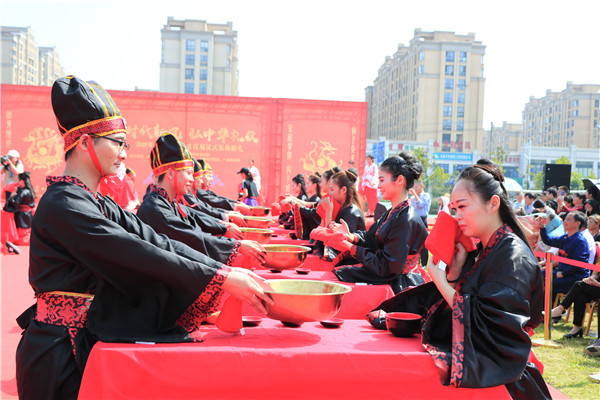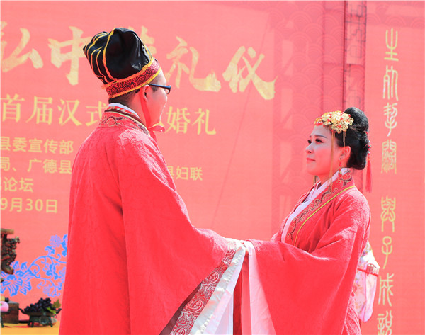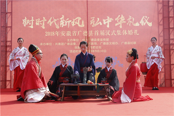 亲迎、盥礼、同牢礼、祭酒、合卺、结发、结缨,整个过程宁静端庄,新郎着黑底红缘的爵弁玄端,新妇穿玄色纯衣纁袡,喜娘和伴娘相随,赞者、司仪、执事等数人主持婚礼仪式。近日,广德县举办了一场“树时代新风、弘中华礼仪”首届汉式集体婚礼。14对新人身着华美汉服,演绎汉式婚礼礼仪,共同发出移风易俗、文明新风的倡议。
