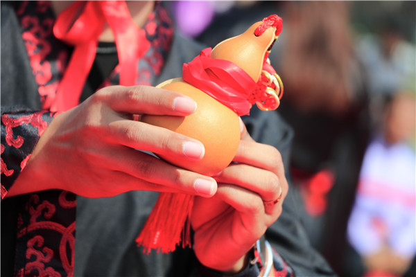 合卺对饮,相邀一生。一对新人各以一系红绳之半瓢交杯对饮,后合二半瓢为一体用红绳系牢,寓意夫妻合二为一。