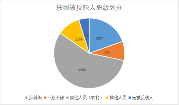 按照被反映人员职级分:乡科级78件,一般干部35件,村级党员干部225件,其他人员42件,无被反映人19件。(宿州市纪委监委 )