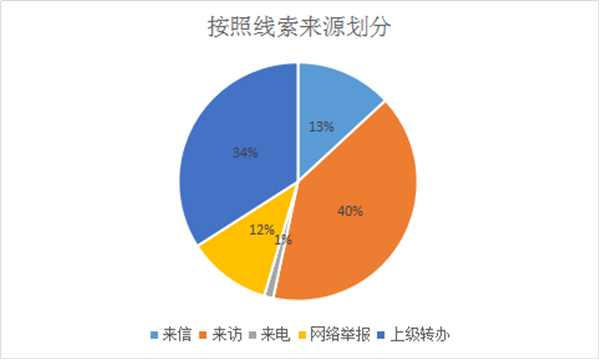 其中,来信53件,占13.1%;来访163件,占40.2%;来电5件,占1.2%;网络举报46件,占11.4%;上级转办138件,占34.1%。