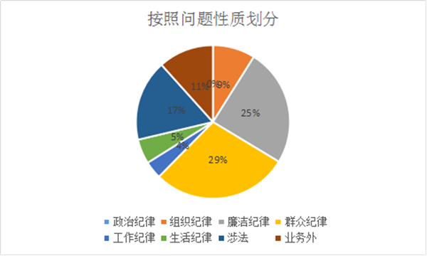 按照所反映问题的性质分:违反组织纪律问题36件,违反廉洁纪律问题100件,违反群众纪律问题116件,违反工作纪律问题15件,违反生活纪律问题21件,涉法类问题69件,业务外问题47件。