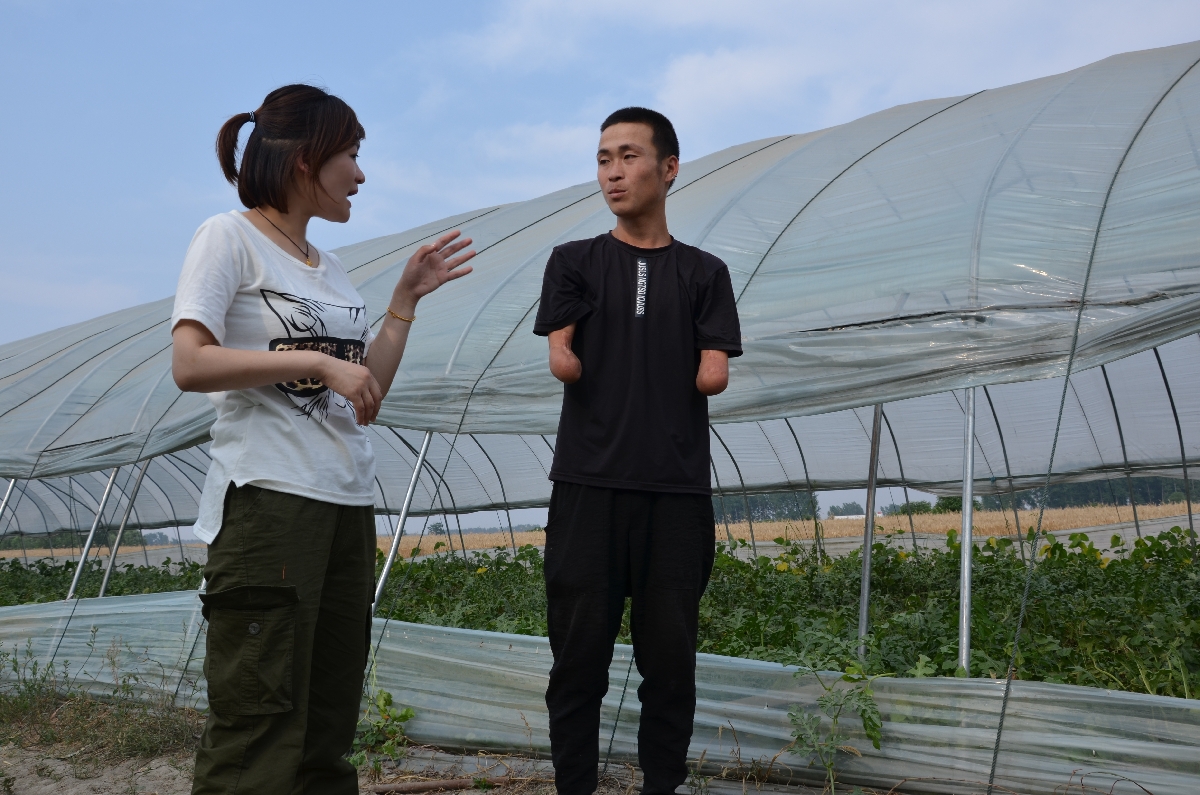 埇桥区芦岭镇南王寨村的因残致贫的年轻小伙,在扶贫工作队和帮扶责任人的帮助下,发展了西瓜种植特色产业。图为帮扶女同志在同他交流西瓜大棚的种植经验,并时常鼓励他正视困难,奋发图强,走出困境。