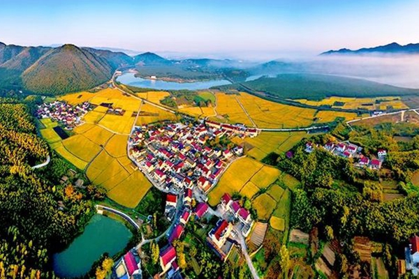 半山半水半分田,看似寻常非等闲。远远望去,绿水、青山、红瓦、青砖,在金色稻田的点缀下,好似在天地中铺开了一幅流光溢彩暖人心的巨大油画!