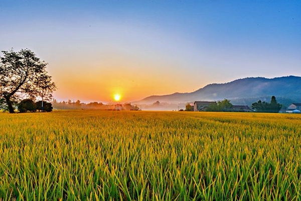 初阳缓缓升起,同样的金黄色与成熟的稻谷不断的交汇、融合,翠绿的山林竹海一起围住这片金黄,仿佛是想要留住这一刻的美好。