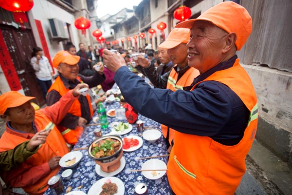 一年365个日夜,无论是夏日炎炎还是风雨凄凄,总能看到环卫工人的身影遍布在大街小巷。这百米长桌宴,更得犒劳辛勤劳作的他们。