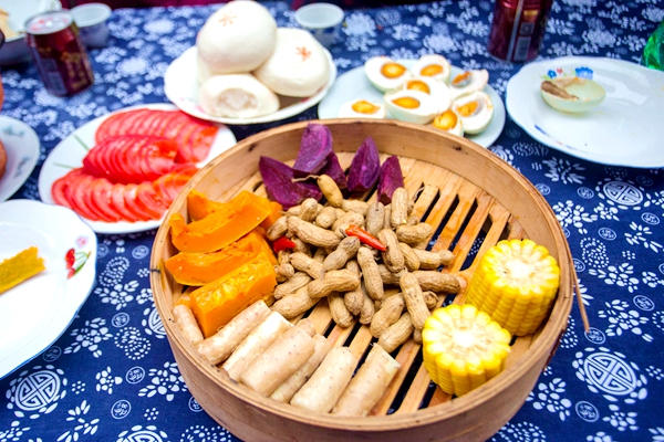 长桌宴上有一道菜特别受欢迎,名为“五谷丰登”,内含南瓜、山药、玉米、花生、紫薯,寓意这又是“颗粒归仓丰收满”的好年头。