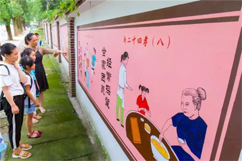 孝廉文化园的文化墙上,市民带着孩子驻足观看并说着新二十四孝。