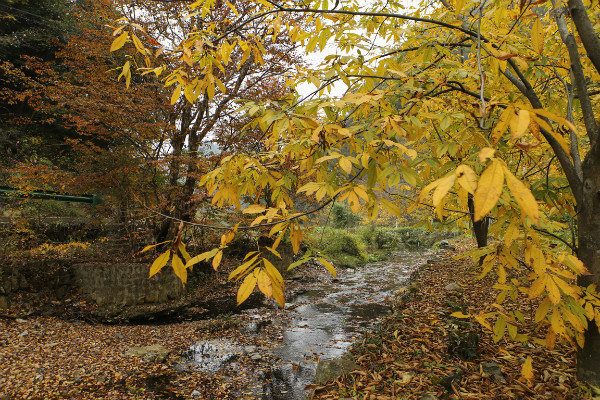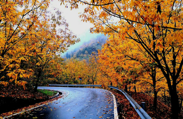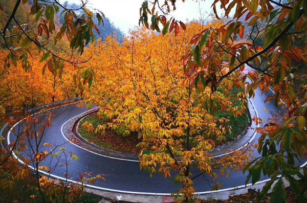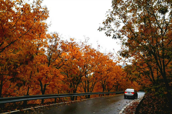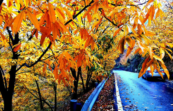 道路两旁的山核桃树叶或在枝头,或飘落而下,或铺满一地,深黄、浅黄、橘黄、柠檬黄,绚丽的色彩不断冲击着人们眼球。