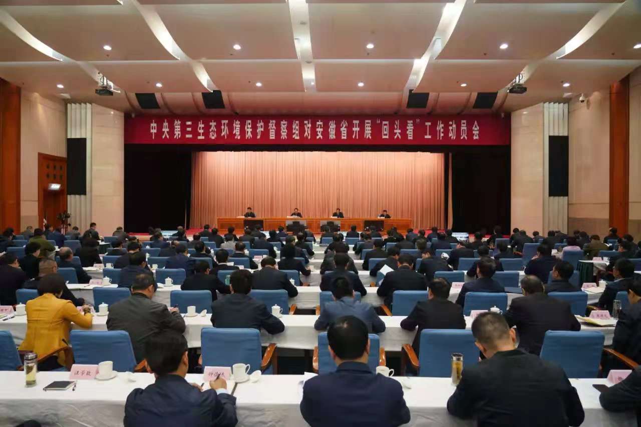为深入贯彻落实习近平生态文明思想,经党中央、国务院批准,中央第三生态环境保护督察组近日进驻安徽省开展环境保护督察“回头看”。10月31日,中央第三生态环境保护督察组对安徽省开展“回头看”工作动员会在合肥召开,督察组组长吴新雄、副组长翟青就做好督察“回头看”工作分别作了讲话,安徽省委书记李锦斌作了动员讲话,会议由安徽省省长李国英主持。