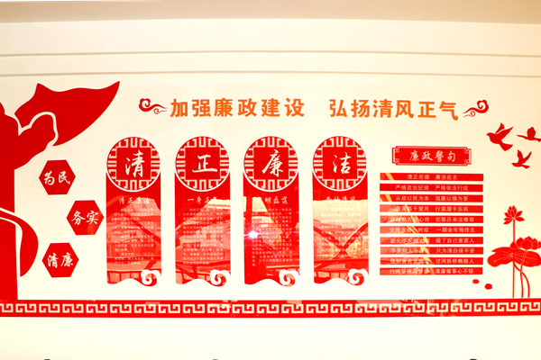 “加强廉政建设、弘扬清风正气。”整面墙上简洁的设计、鲜红的背景、显目的词句,潜移默化中让党员干部受到熏陶、净化心灵。