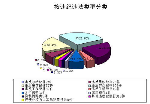 在377件检举控告类信访中,违反政治纪律行为2件,违反组织纪律行为25件,违反廉洁纪律行为77件,违反群众纪律行为108件,违反工作纪律行为87件,违反生活纪律行为19件,分别占比0.53%、6.63%、20.42%、28.65%、23.08%、5.04%;贪污受贿类行为34件,滥用职权类行为4件,徇私舞弊类行为5件,行使公权力过程中发生的其他违法犯罪行为8件,其他违法犯罪行为8件,分别占比9.02%、1.06%、1.33%、2.12%、2.12%。
