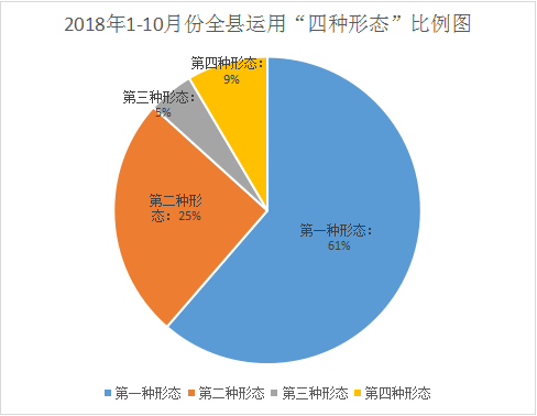2018年1-10月,全县纪检监察机关运用监督执纪“四种形态”处理355人次,其中第一种形态218人次,占比61.4%;第二种形态90人次,占比25.4%;第三种形态17人次,占比4.8%;第四种形态30人次,占比8.5%。