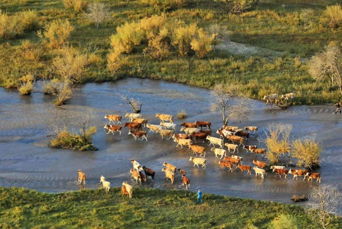 一群牛羊从待了一个夏天的牧场辗转到下一个冬日牧场,成群结队地奔腾在草原之上,像是给无边的绿毯绣上了丰富多彩的大花。
