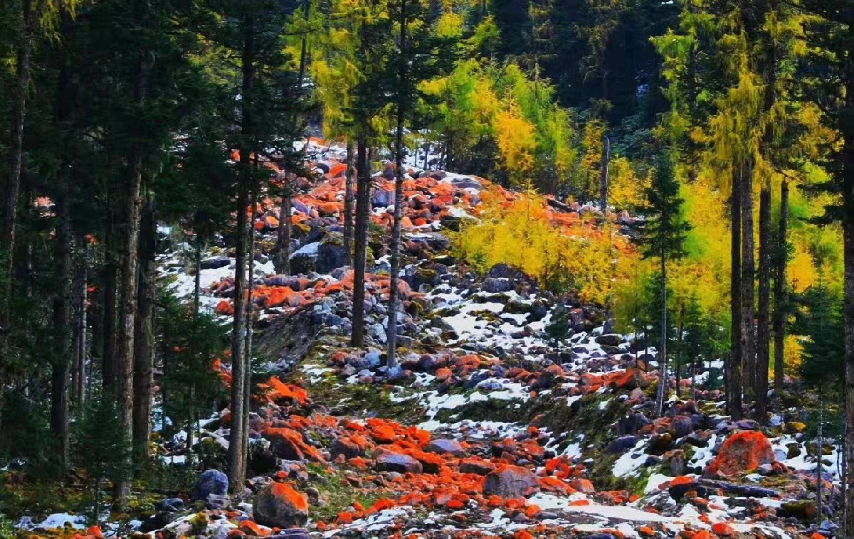冬雪过后,树林间一颗颗红石头若隐若现,像镶嵌在大地上的片片红叶,即使大雪覆盖,依旧红的耀眼。
