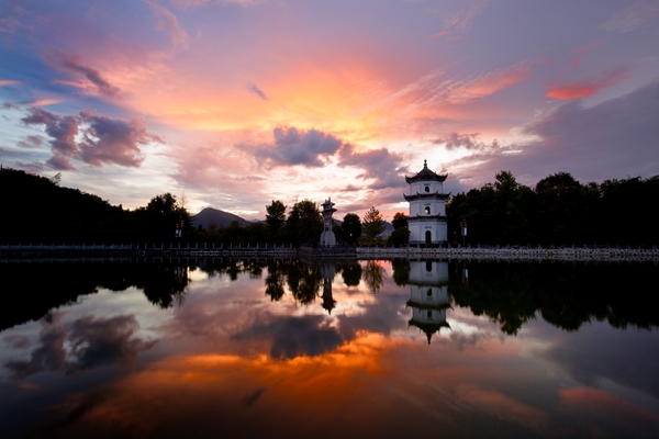 “落霞与孤鹜齐飞,秋水共长天一色。”水天一色,傍晚的火烧云为古塔笼罩一层更加神秘的面纱,好似梦境一般。