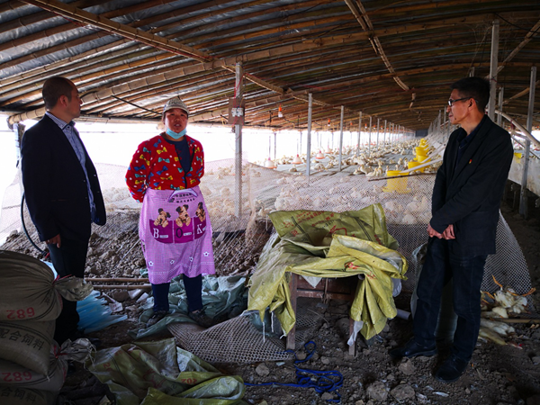 卢支广户利用扶贫贷款投资肉鸭养殖,回访检查小组正与其攀谈了解情况。