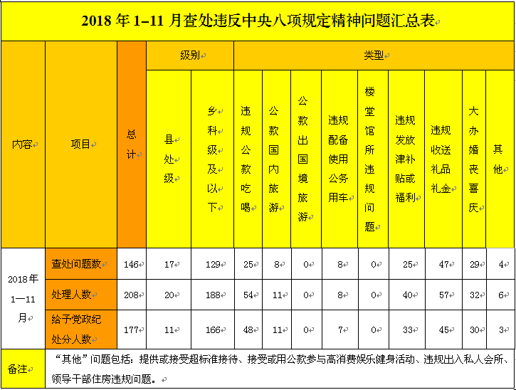 从问题查处的类型看:违规收送礼品礼金47起,大办婚丧喜庆29起、违规公款吃喝25起,分别占问题总数32.19%、19.86%、17.12%,分别比去年同期增加4.44%、20.83%、150%。违规发放津补贴或福利25起,同比下降40.48%。违规配备使用公务用车8起,同比下降60%。公款国内旅游8起,同去年同期增加6起。其他类问题4起,比去年同期减少5起。没有发生公款出国境旅游和楼堂馆所违规问题。