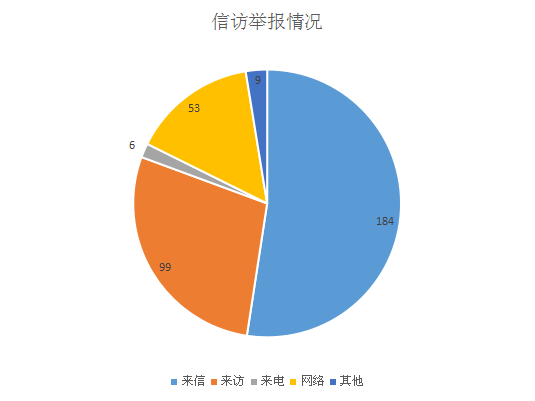 1至11月,全县纪检监察机关共受理信访举报351件(不包括上级转办件),其中来信184件,占52.4%;来访99件,占28.2%;来电6件,占1.7%;网络53件,占15.1%;其它9件,占2.6%。