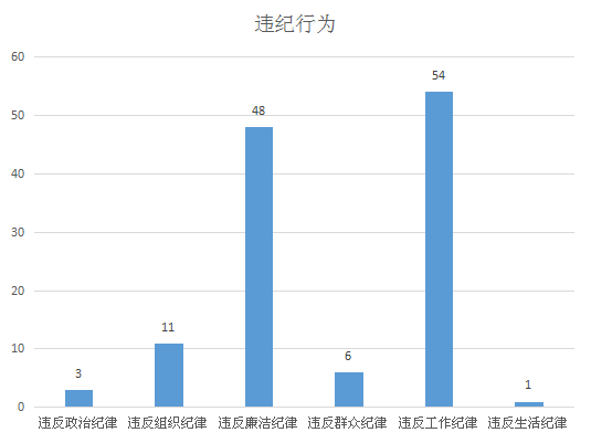 从处分人员违纪类型情况来看(同一个案件涉及多个违纪行为多次计算),违反政治纪律3人次;违反组织纪律11人次;违反廉洁纪律48人次;违反群众纪律6人次;违反工作纪律54人次;违反生活纪律1人次。