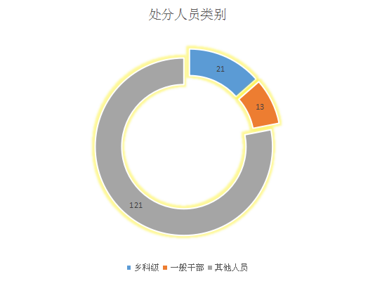 从处分人员职级来看,处分的155人中,乡科级干部21人,占13.5%;一般干部13人,占8.4%;其他人员121人,占78.1%。