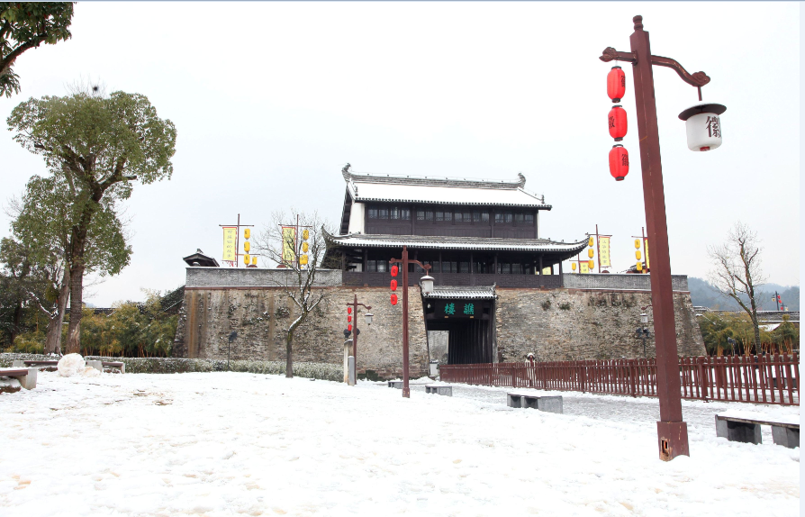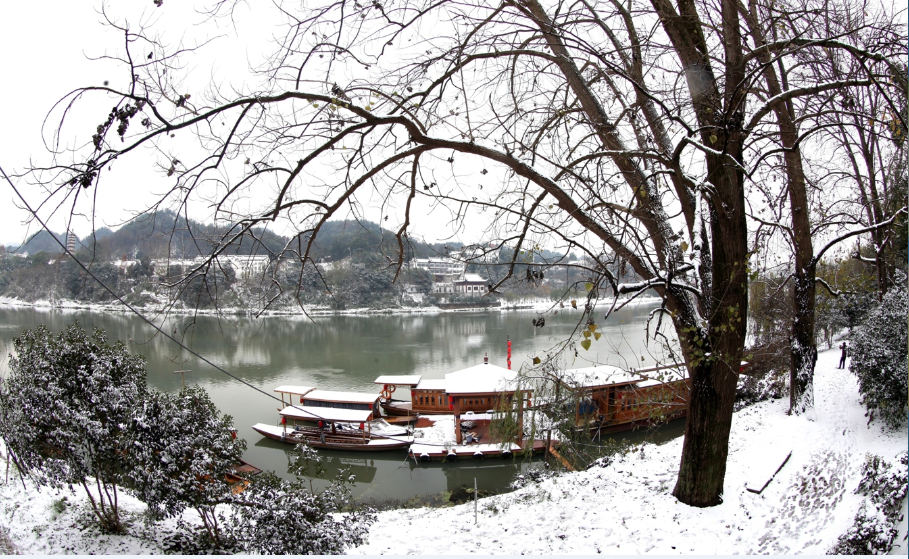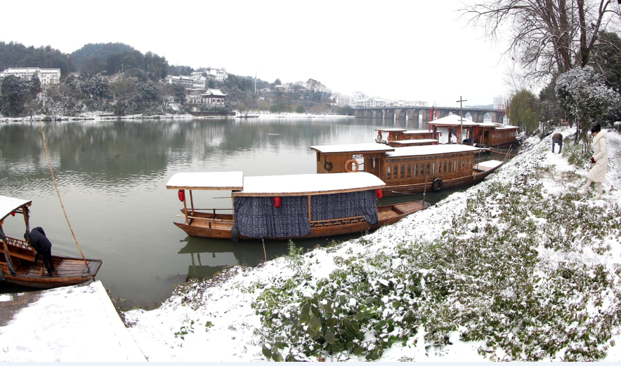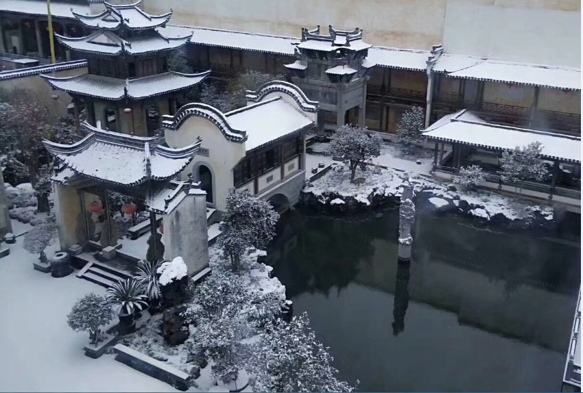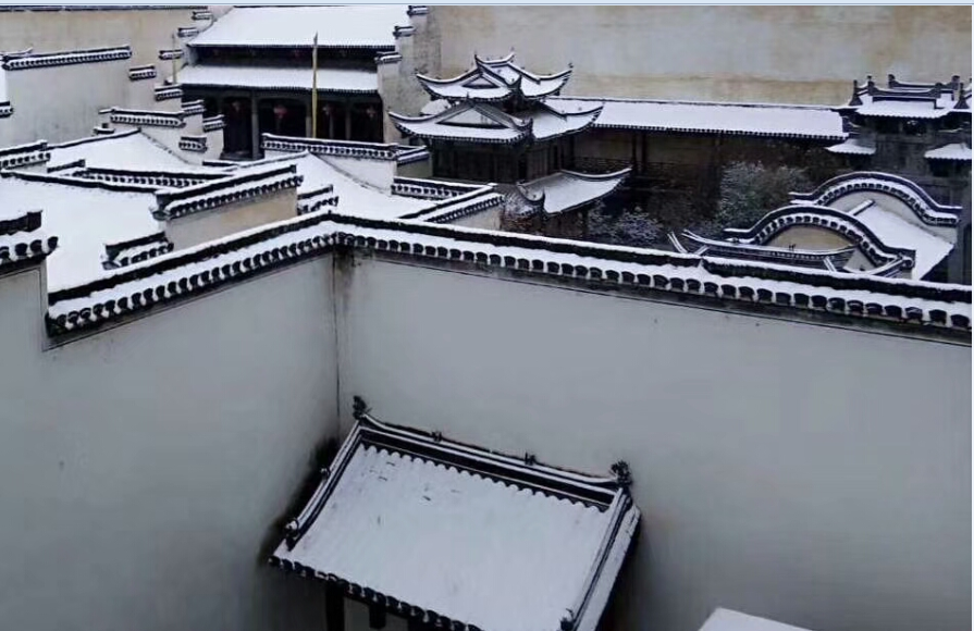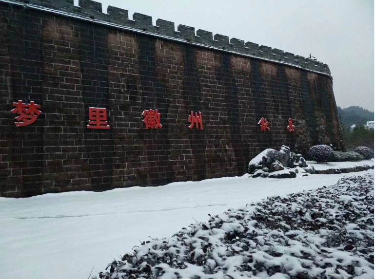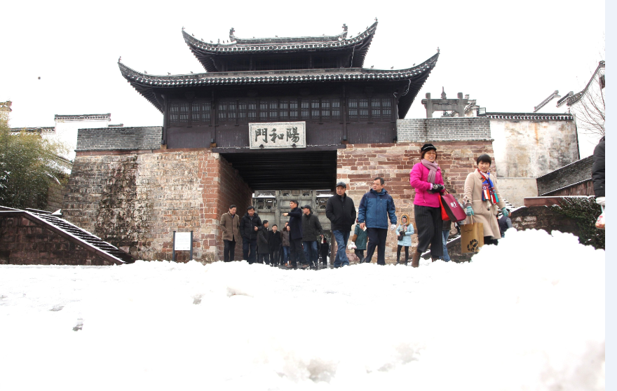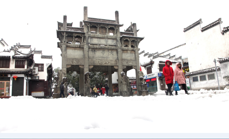 12月9日,安徽歙县徽州古城内,游客在徽城镇中和街赏雪景观古城。2018年第一场雪给徽州古城增添了美景,练江河两岸风光旖旎,古塔、古桥、古建筑在雪的覆盖下显得更加厚重。