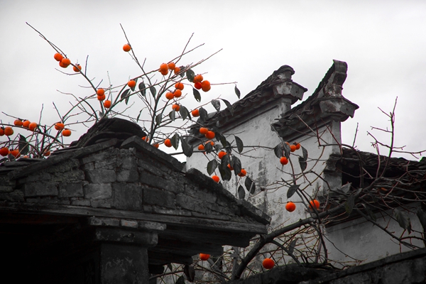 三两步外,马头墙下,红彤彤的柿子挂满枝头。有的一枝独秀、有的紧簇相拥,火红的色彩与青瓦白墙形成了鲜明对比,极具视觉冲击力,吸引来无数游客争相观赏。