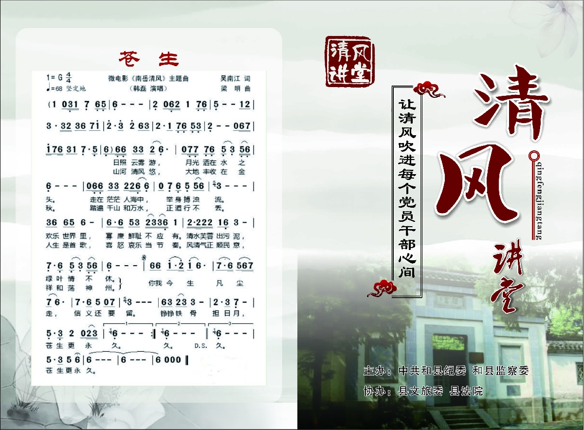 “清水芙蓉出污泥,绿叶情不休”,一曲慷慨激扬的《苍生》讴歌了党员干部务实清廉的信仰,党员干部只有以“铮铮铁骨担日月”,才能赢得“风清气正顺民意,祥和荡神州。”发人深省的歌词和深情厚重的演唱,呼吁广大党员干部勿忘廉洁,拒绝贪腐,洁身自好,永葆本色。