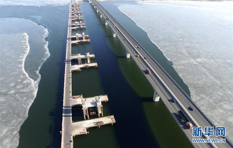 这是2017年2月14日航拍的横跨官厅水库的京张高铁特大桥(左)与京张高速公路特大桥。京张高铁是北京冬奥会交通配套工程。 新华社发(武殿森 摄)