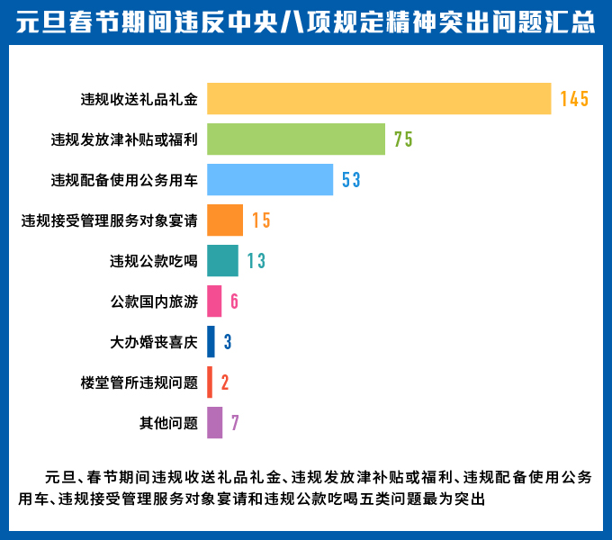 比如,浙江省杭州市西湖区风景旅游局原党组书记、局长章洪根在元旦、春节等节日期间,多次违规收受管理服务对象所送购物卡、充值卡等,共计价值人民币3.7万元。原银川物资集团公司党委书记、总经理郑波,在元旦、春节等节假日,多次以过节费、防暑费、劳保费、季度奖、年终奖等名义,给本人及公司职工发放福利共计515036元。