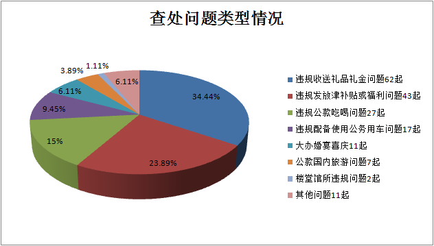 据统计,1-12月份,全市共查处违反中央八项规定精神问题180起,处理222人,给予党纪政务处分159人。其中,在查处的180起问题中,违规收送礼品礼金问题62起,占34.44%;违规发放津补贴或福利问题43起,占23.89%;违规公款吃喝问题27起,占15%;违规配备使用公务用车问题17起,占9.45%;大办婚宴喜庆11起,占6.11%;公款国内旅游问题7起,占3.89%;楼堂馆所违规问题2起,占1.11%;其他问题11起,占6.11%。