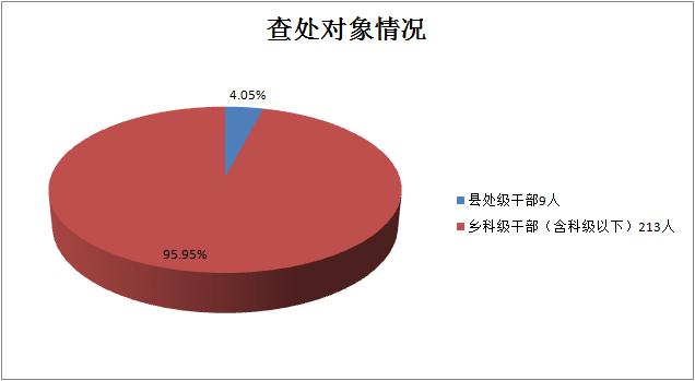 1-12月份,全市共查处222人,其中县处级干部9人,占总数的4.05% ;乡科级干部(含科级以下)213人,占总数的95.95%。全市各级纪检监察机关利用文件、网络等媒体通报曝光违反中央八项规定精神问题共35批次66起,涉及82人。