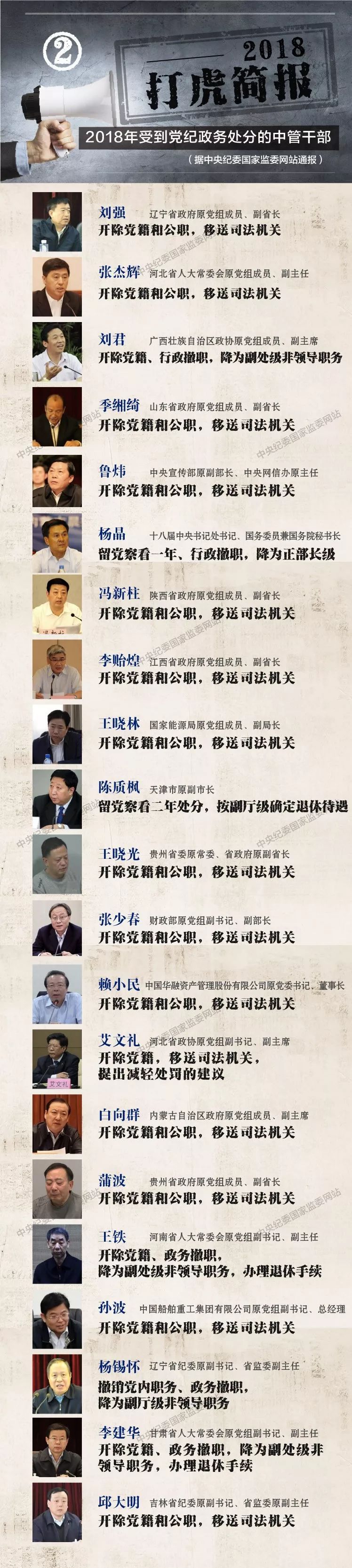 ——严重违纪、严重触犯刑律的党员必须开除党籍;涉及严重违法犯罪,必须移送司法机关。2018年公布处理结果的21名中管干部里,18人被开除党籍,15人被移送检察机关审查起诉。