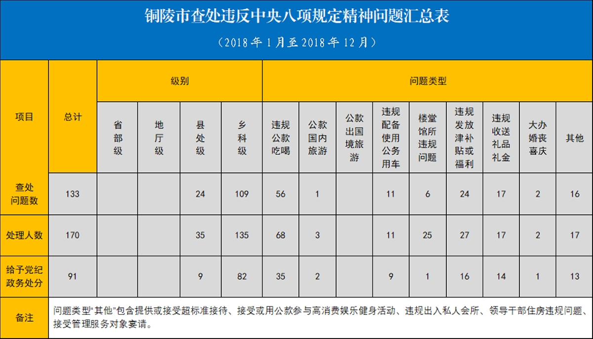 2018年,铜陵市纪检监察机关始终坚持把纪律和规矩挺在前面,聚焦“四风”问题新动向、新表现,不断创新监督方式,加大监督力度,提升监督实效,全年共查处违反中央八项规定精神问题133起,处理170人,其中给予党纪政务处分91人。具体情况如下: