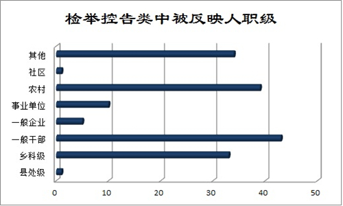 在检举控告类信访举报件中,从被反映人职级来看,反映县处级干部1件;乡科级干部33件;一般干部43件;一般企业人员5件;事业单位人员10件;农村人员39件;社区人员1件;其他人员34件。