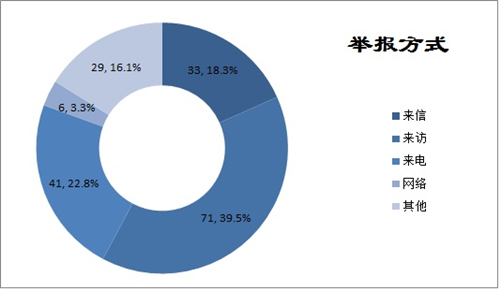 从举报方式来看,来信33件,占18.3%;来访71件,占39.5%;来电41件,占22.8%;网络举报6件,占3.3%;其他29件,占16.1%。