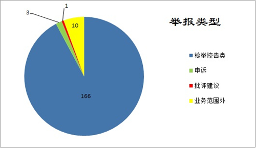 从举报类型来看,检举控告类166件,占92.2%;申诉3件,占1.6%;批评建议1件,占0.6%;业务范围外10件,占5.6%。