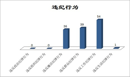 在检举控告类信访举报件中,按违纪行为分类,违反廉洁纪律行为36件,违反群众纪律行为39件,违反工作纪律行为54件,违反生活纪律行为1件。