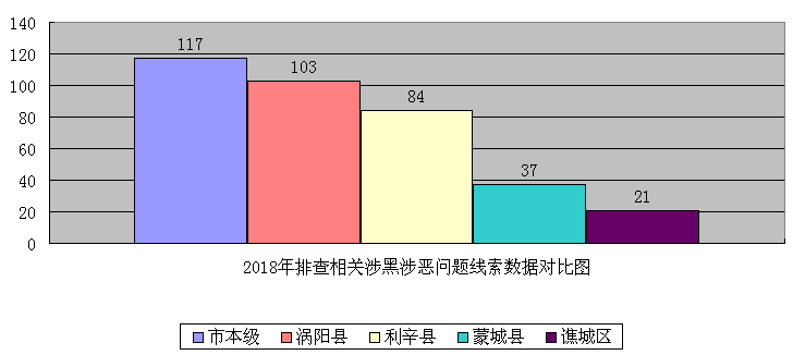 紧抓扫黑除恶专项斗争监督执纪问责。2018年,全市各级纪检监察机关对涉黑涉恶案件提前介入、同步调查,做到纪法衔接、协调推进,严格落实政法机关、纪检监察机关问题线索双向移送反馈机制,互相移送涉黑涉恶案件线索77件、17件。全市共排查相关涉黑涉恶问题线索438件,其中市本级117件、涡阳县103件、利辛县84件、蒙城县37件、谯城区21件,省扫黑除恶督导期间移交76件,已查处21件25人,给予党纪政务处分15人,移送司法机关10人。通报曝光典型案例3起6人。
