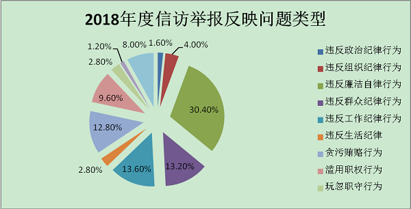 从信访量来看,2018年度共受理信访举报297件,与2017年度持平(2018年度受理信访件287件)。其中纪检监察检举控告业务范围内举报213件,批评建议类4件,申诉类2件,纪检监察业务外78件。