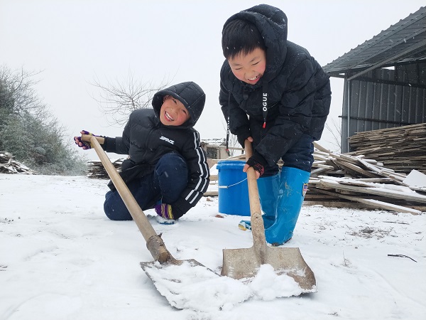 寒气袭林枝垂玉 稚童扫雪玉为尘