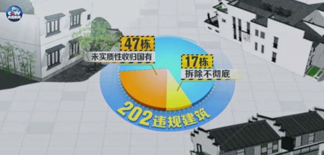 中央专项整治工作组发现,在2014年号称整治完毕的202栋违建别墅中,实际上只进行了部分处置:号称全部拆除的别墅中有17栋拆除不彻底;号称没收的47栋一直未履行任何实质性收归国有手续,只是在门上贴了封条。