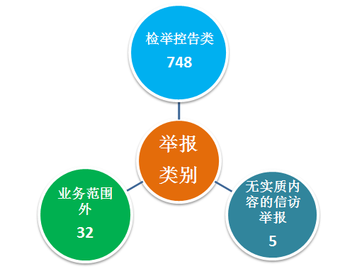 从信访举报分类上看,检举控告类748件,业务范围外32件,无实质内容的信访举报5件。