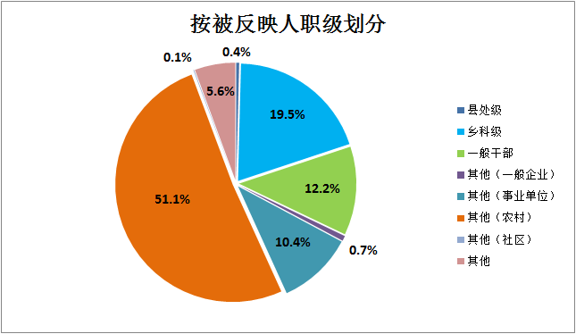 按照被反映人职级划分:县处级3件,乡科级146件,一般干部91件,其他人员中一般企业5件、事业单位78件、农村382件、社区1件,其他42件。(宿州市纪委监委)