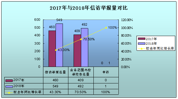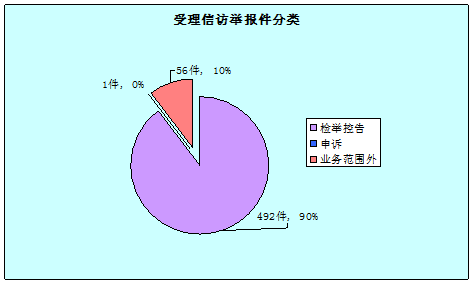 2018年,共受理来信、来访、来电、网络等各类信访举报549件。其中检举控告492件,约占89.6%;申诉1件,约占0.18%;业务范围外56件,约占10.2%。