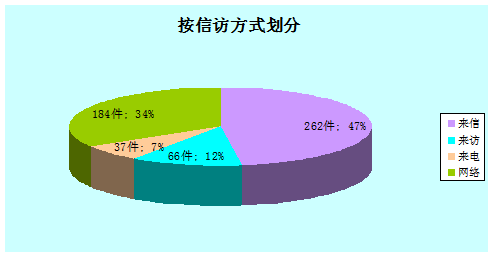 2018年受理的信访举报以来信、网络举报为主。其中,来信262件,占47.7%,网络举报184件,占33.6%,这两类信访举报合计占81.5%;来访66件,占12.2%;电话举报37件,占6.7%。
